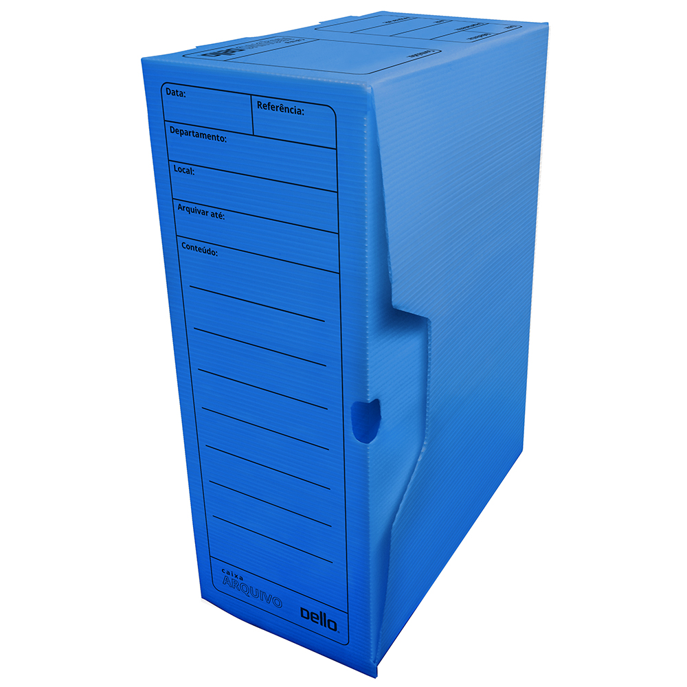 Caixa em plástico corrugado no tamanho ofício. Possui 3 áreas em diferentes posições de identificação.